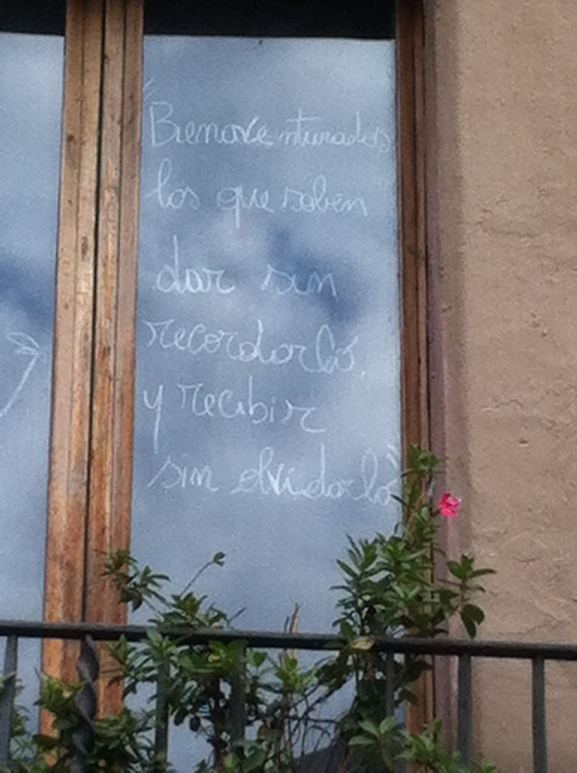 Uno de estos días de Navidad, haciendo la calle, nos llamó la atención un balcón. En su cristal, con tinta blanca, algo habían escrito para ser leído desde la calle. Nos paramos para descifrarlo: era una nueva bienaventuranza y decía: